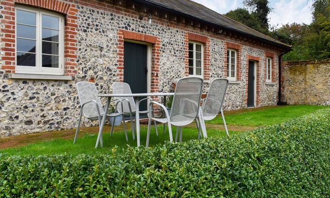 Shower room: With shower cubicle, toilet, heated towel rail and washing machine.. Gas underfloor central heating, electricity, bed linen, towels and Wi-Fi included. Initial logs for wood burner included. Travel cot, highchair and fireguard. Welcome pack. Small lawned garden with sitting-out area. Tennis court (shared). Private parking for 3 cars. No smoking. . Enjoy taking family holidays at The Old Dairy Cottage, in the lovely Kent countryside setting, in an Area of Outstanding Natural Beauty. This single-storey cottage has been converted from the dairy barn and housing for calves and was formally part of a mixed farmstead in this quintessential hop-growing Kentish valley. The gorgeous flint stone exterior matches with the countryside theme, and the Grade II Listed 18th century Maplescome farm house. The interior is light and airy with a modern feel throughout. Socialising with friends or family is relaxed here with the spacious open plan living area, complete with a Smart TV and DVD player. Some friendly competition between friends and family can take place on the tennis courts, shared with the owners, tennis rackets and balls will be provided.