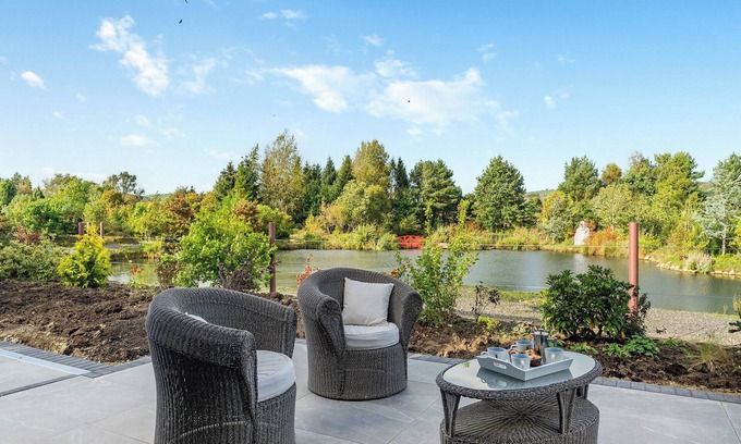 Bedroom 2: Kingsize (5ft) Bed, Smart TV Ensuite: Slipper Bath With Shower Attachment, Heated Towel Rail, Toilet. Air source heat pump underfloor heating, electricity, bed linen, towels and Wi-Fi included. Welcome pack. Grounds with terrace, patio, garden furniture and barbecue. Bike store. Private parking for 2 cars. No smoking. Please note: There is a large lake in the grounds.. Welcome to our stunning holiday cottage in the most unique setting in the popular village of Lanchester near Durham. Newly built in 2022, this contemporary barn-style property offers a unique experience in a tranquil location. Its prime spot overlooks a beautifully landscaped lake and an expansive 30 acres of open countryside adorned with majestic mature trees and frequented by a wide array of wildlife like kingfishers, osprey, otters and families of ducks, making this a nature lovers’ paradise.