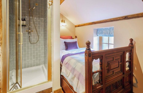 The open-plan living and dining space is the heart of the home, centred around a cosy log-burning stove, perfect for relaxing evenings. The well-equipped kitchen features an electric AGA alongside home-from-home appliances, ensuring a seamless self-catering experience.