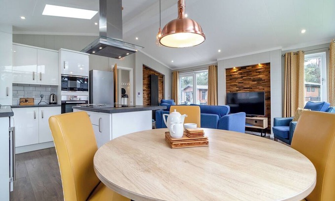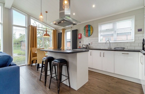 Luxurious and contemporary lodge with one double with en suite shower room and one twin. Spacious bathroom with bath with overhead shower. Modern well equipped open-plan living, dining area and kitchen. Patio doors leading to spacious decking area.