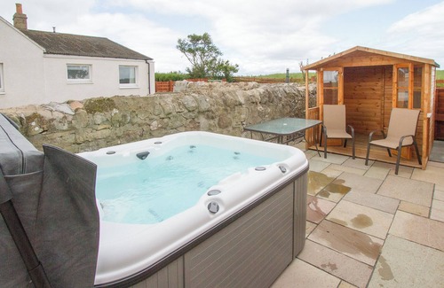 Bathroom: Bath With Shower Over, Heated Towel Rail, Toilet. Electric central heating, electricity, bed linen, towels and Wi-Fi included.. Large enclosed garden with sitting-out area, garden furniture and summerhouse. Hot tub for 4 (private). 2 dogs welcome, to be kept on a lead at all times (sheep country). Private parking for 2 cars. No smoking.. Grieve’s Cottage is a delightful traditional stone cottage situated in its own generous garden grounds with a state-of-the-art hot tub for visitors’ sole use. Situated amidst open countryside, with stunning uninterrupted views in all directions, the cottage is a wonderful place to relax and enjoy its very good quality facilities and accommodation.