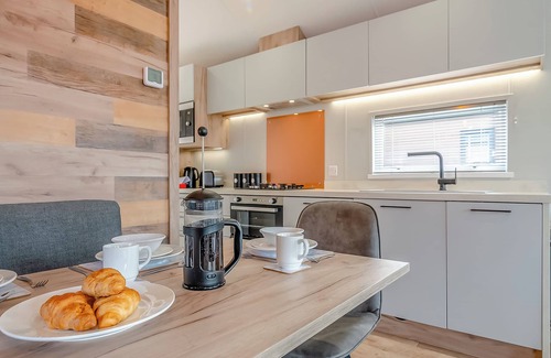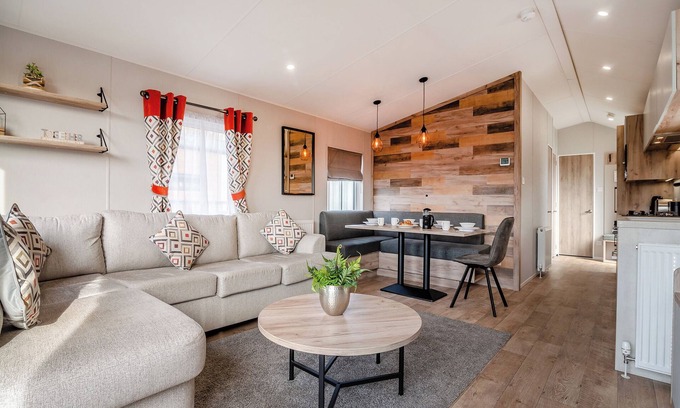 The luxurious lodges in the Flat Cap Collection are beautifully designed to have a warm, homely feel with a chic twist. It has everything the whole family needs to enjoy unforgettable holidays. including a private hot tub. The spacious living space is enhanced with aspect French doors leading onto the outside space with decking, garden furniture and a hot tub. The sofa is perfect for cosying up and watching your favourite films. The kitchen and dining area is cleverly split with a semi-partition and is well appointed with everything you need to cook up a storm.