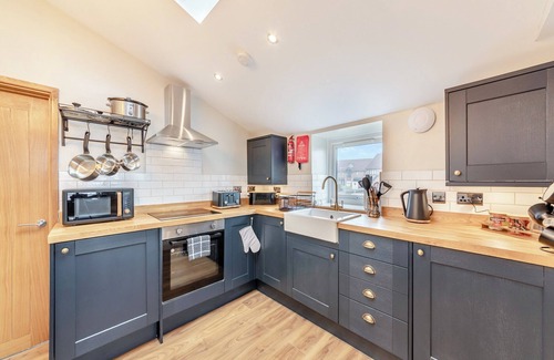 Stepping inside, be greeted by the ambiance of sloping floors, low doors, and quirky cottage stairs. The open-plan living area serves as the heart of the home, boasting sea views, a Smart TV with Netflix, and a snug window seat. Adjacent, a dining table invites leisurely meals while taking in the panoramic scenery. Descending two steps leads to the kitchen, resplendent with blue country-style units and modern appliances ensuring culinary endeavours are a breeze.