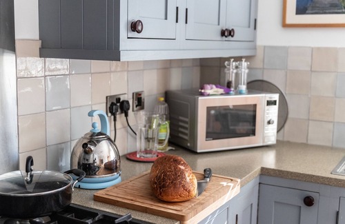 The living room has a cosy wood burner and there’s a Lacanche range cooker in the kitchen for those days when you want to eat in. You can stock up at the mini supermarket nearby. An oak stable door leads to the rear courtyard with a seating area and the lawned garden to the front makes a peaceful spot to relax in the sunshine.
