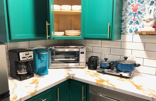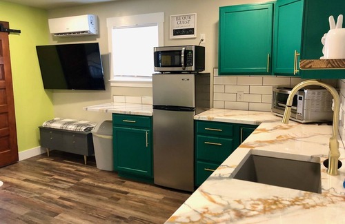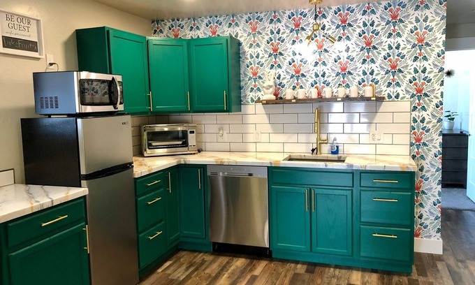 Welcome to the "Edge Loop" unit at Mojoe Inn! Enjoy being in the heart of Downtown Fruita in this unique apartment. Once a hotel 100 years ago, this building has been renovated for modern guests while still maintaining original charm and a true downtown feel. Each apartment is one-of-a-kind with fun design elements and comforts including fast WIFI and on-site laundry! Walk one block to Fruita's main street and enjoy world-class mountain biking and endless outdoor recreation within minutes! This apartment is second floor with 2 bedrooms (one king bed, one queen bed), beautiful bathroom and a deluxe kitchenette (mid-size fridge, full dishwasher, convection oven, hot plate). Shared garage for bike storage only. Each apartment gets one off-street parking spot; street parking also available. Pet-friendly with pet fee (please pick up pet waste!).