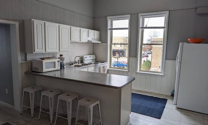 Welcome to our 2-bedroom apartment, located on and overlooking the town square. This apartment is in a unique old building that we are renovating for updated charm. The lofty ceilings of the first floor require many steps up, but the higher altitude of the apartment gives more of a bird's-eye view of the town center. Whether you're here for business or leisure, our comfortable 2-bedroom apartment provides an ideal home base to explore and experience the best of the area.