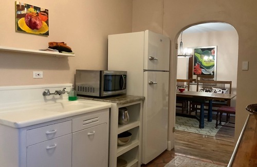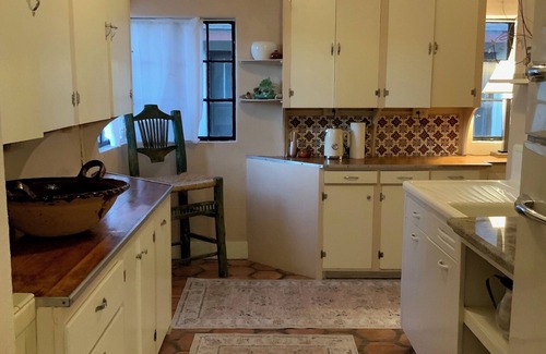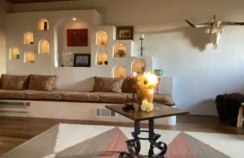 In the Heart of Tucumcari , New Mexico,behind the high adobe walls is a delightful little castle which offers a charming escape. 2 large bedrooms featuring queen beds dressed in all natural fibers like cotton and bamboo sheets both bedrooms have ceiling fans so you can control the comfort. The Big bathroom features a large step in ( 5”)shower , rustic carved stone sink. We use the “Who Gives A Crap” brand eco- friendly paper products, cotton towels and even our soap is locally sourced and exclusively made scent by Branu goat products right here in Tucumcari! in shape of our cow skull trademark. Of course we have central AC and heating, Our Southwest style oozes throughout the castle with lighted Nichos and the banquets in the living room and the Handmade Saltillo tiles that floor the breakfast room. The updated retro kitchen will remind you of your grandmothers house. Big farm sink and ceiling high cabinets with original hardware. Serve your yummies in the ample dining room that seat 10 with courtyard view. Outside patios surround the castle with cozy corners for shade or sun. We even have a secret back garden..