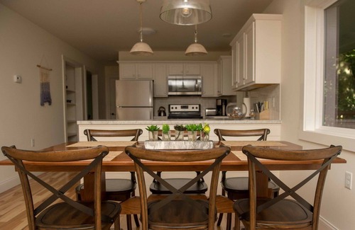 Soak in the morning light on the balcony overlooking the creek or enjoy an afternoon brunch on the covered porch. On cooler nights, gather around the fire pit and make s'mores. The Creek House features an open living room/kitchen, bedroom with queen bed, second bedroom with queen bed and full bed, single bathroom, and a utility room with washer/dryer.