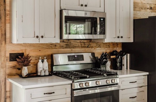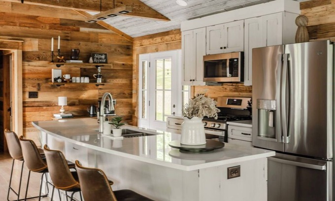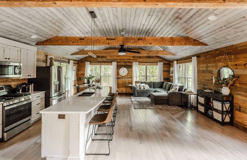 This 2-bedroom cabin sleeps up to 4 guests and features a modern rustic style with reclaimed wood throughout, exposed beams, and subtle western touches. Both bedrooms have queen-size beds. The open-concept living area includes a large sectional sofa, a dining table for four, and a full kitchen with new appliances, a large island with bar seating, and a well-stocked setup for cooking and dining. A dedicated coffee bar offers coffee and tea options for guests.