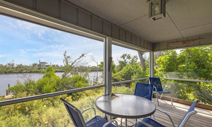 Seasonal rental. Lovely 2BR/1.5B townhome right across a little sandy road from the Gulf of Mexico. Screened lanai overlooking Bocilla Lagoon. Enjoy the best of both worlds, lagoon waterfront with great fishing right off dock, and Gulf view and beach access right off driveway. Due to damage from Hurricanes Helene and Milton, the community pool, tennis courts and docks will not be available during 2025.. Sleeps six comfortably. Living room has a pull out sleeper sofa. Have you vacationed on the island before? Palm Island a.k.a. Don Pedro Island, is a barrier island 7 miles long between Sarasota and Ft. Myers on the Gulf coast with sugar-sand beaches, beautiful harbors and lagoons, great fishing and shelling only accessible by a short 10 minute car ferry or private boat. Our beaches are some of the most pristine and quiet in all of coastal Florida. There are no high rises blocking your Gulf views, unpaved sandy roads, and a relaxed "Old Florida" atmosphere. There is one restaurant called the Rum Bay that serves lunch and dinner. The car ferry runs continually from 6:30 am until 10:00 pm from Sunday through Thursday and until 11:00 pm Friday and 12:00 midnight Saturday. You drive your car onto the ferry and then directly to your vacation rental home. It's a very special place to vacation. We have kayak rentals and golf cart rentals for your use during your vacation. All of our properties on Palm Island require a ferry ride to get there. One round trip on the ferry for car and passengers costs $55. The alternative is to purchase a book of 10 round trips for $380, or $38 per round trip. For more information on the ferry, google Palm Island Transit.