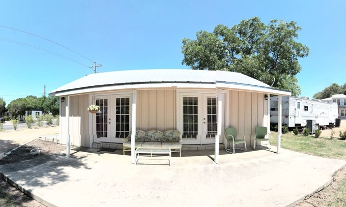 This 2-bedroom cottage overlooks the lawn area adjacent to the River Trail path and the Guadalupe River.