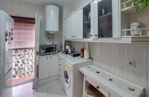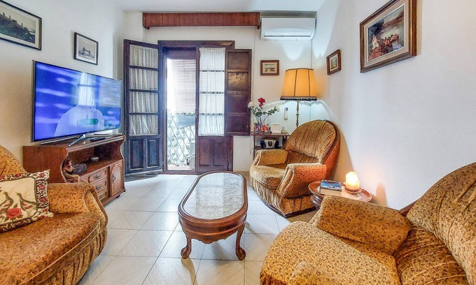 Experience authentic Andalusian city life in an apartment that impresses with its nostalgic style. Step into a classic living room with cosy upholstered furniture and antique furnishings. Take a seat at the dining table for communal meals or relaxed evening gatherings. The traditional wooden elements and chandeliers lend the various rooms a special flair. Cook in the separate kitchen with plenty of storage space, ideal for a longer stay.