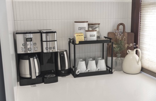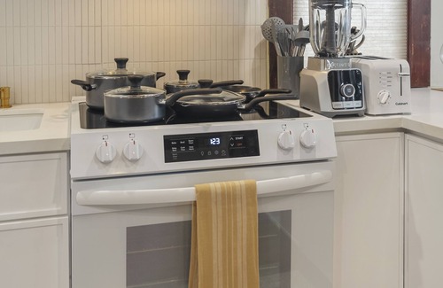 Kitchen: Well-equipped kitchen with refrigerator, electric stove, microwave, dishwasher, toaster, blender, coffee station, hot water kettle, pots/pans. 4 counter stools for dining.