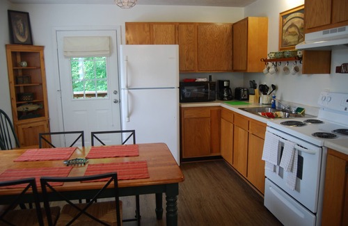 *This listing is for our Cottage # 3, which is our Fishing Lodge. We have decorated for the fishing enthusiast and family! TV with Dish network and high spreed internet. One bedroom has a queen bed and the other with two twin beds. We also have provide extra linens and plenty of room for you to bring an air mattress, with a limit of 6 people per cabin. We have a fully equipped kitchen with everything needed to prepare a meal, including a coffee maker with filters. ( bring your own coffee) Family room space has a flat screen TV and cable. There is also a deck to enjoy the serine location with a table and four chairs. (There are stairs to climb leading to this cabin)