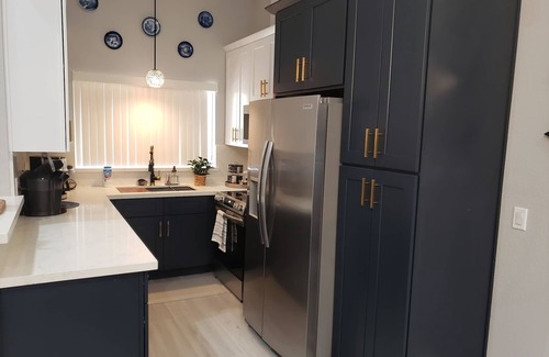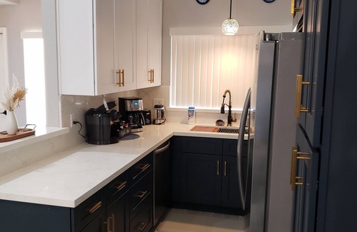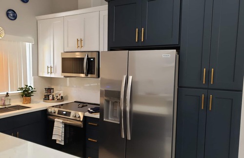 Fully equipped kitchen. All linens, towels, complimentary soaps, shampoos, laundry detergent included.