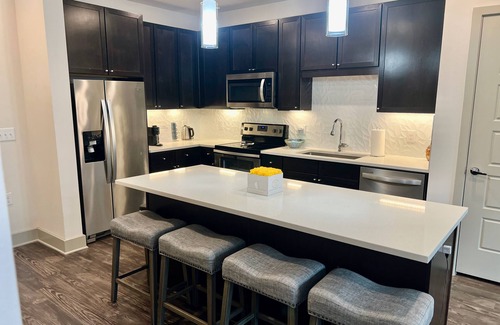 Experience modern luxury at our 2 bed, 2 bath Heart of Frisco Gem. Perfect for families, business travelers, or weekend getaways, this spacious apartment features upscale finishes, a full kitchen, and private balcony. Enjoy resort-style amenities including a pool, gym, and co-working lounge. Located near The Star, Stonebriar Mall, and top Frisco dining, our short-term rental offers comfort, convenience, and an unbeatable location in the heart of Frisco.