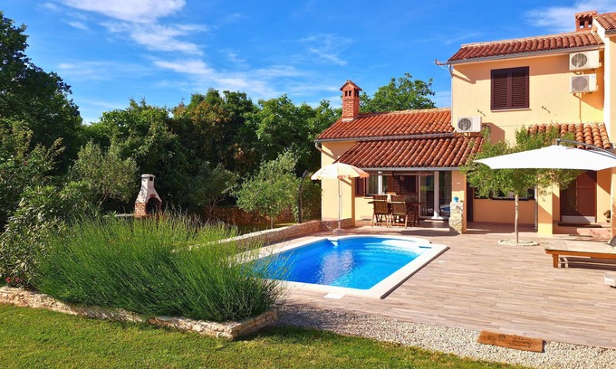 If you want to spend the vacation in a green oasis, this is the place for you. Relax in this semi-detached house with pool, where the interior is very modern and comfortable. While the children romp on the playground equipment in the garden, you can enjoy the sun and relax. For the adventurous there is an adrenaline park in the neighboring village of Glavani, in Manjadvorci there is an equestrian center and the nearest beaches are in Krnica and Duga uvala with aqua park. Visit the interesting city of Pula and the Brijuni National Park.