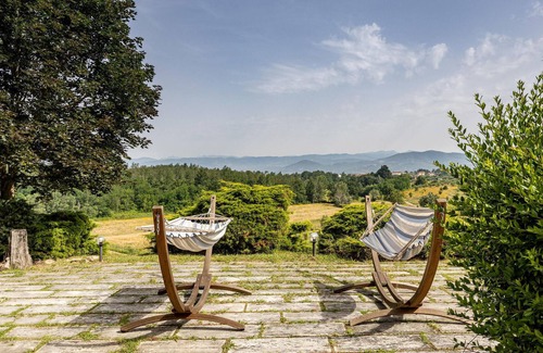 This lovely vacation apartment welcomes up to six adults and an additional toddler with its two bedrooms, open loft, two bathrooms and two kitchenettes. It is nicely furnished and especially impresses with its beautiful outdoor area. In and around the shared pool you can enjoy the wonderful Tuscan weather all day long. On the beautiful terrace you can have breakfast in the morning or end the day with a glass of local wine while enjoying the wonderful panorama.