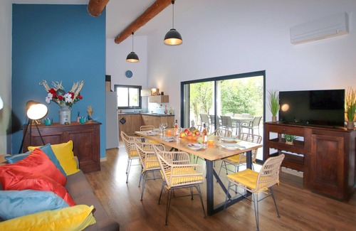 Nestled in the beautiful natural landscape of the southern Ardèche, this oasis of peace built from local natural stone welcomes you with tastefully and colourfully decorated rooms. Look forward to convivial meals and cheerful game evenings at the long dining table and enjoy the cosy ambience with a comfortable film evening or a good read.