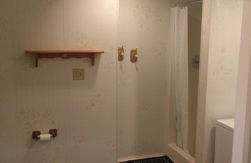 Bathroom has a shower, along with a washer and dryer for you. vacuum cleaner is provided to help clean the place during your stay.