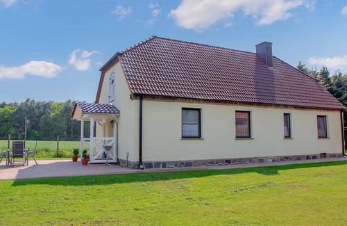 The holiday home is located in the Starsow district of Mirov, approx. 1.5 km outside the town in a quiet rural setting. It is located on a private residential property of approx. 5000 square metres with a view of the fields and forest. It was completely renovated in 2017 and largely refurnished. The holiday home has a living room with corner sofa, LED TV and radio, a bedroom with double bed and wardrobe, a second bedroom with single bed, a kitchen with dining area, electric cooker, fridge-freezer and microwave, shower/WC and central heating. The couch in the living room can be used as an extra bed. The windows are fitted with insect screens. The house also has a W-LAN connection. Outside there is a terrace with seating area, charcoal barbecue, car park and a bicycle storage room. The total price includes bed linen, water and energy consumption, extra bed and final cleaning. Mirow is subject to visitor's tax.