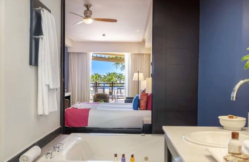 Located at The Grand Mayan Resort - this 2 bedroom suite offers you 2 bedrooms with two king-size beds, living and dining room, full kitchen, 2 bathrooms (one with jacuzzi), private terrace with lounge pool overlooking the ocean and garden pools within the resort. Spa and fitness center access, golf courses with off-site club house, and on-site restaurants for breakfast, lunch, snacks and fine dining. There are also buffet options in addition to room service, and The OMNIA BEACH-CLUB featuring world-class DJ's on weekends.