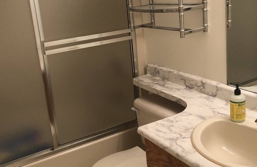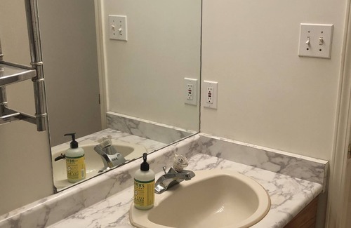 Cute 2 bedroom apartment with gas fireplace Large 65” TV and hardwood floors.