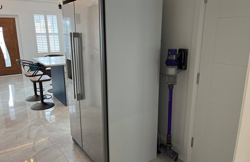 The kitchen has a fridge, a hob, an oven, a toaster, a kettle, a coffee maker, a dishwasher, a freezer and a microwave.