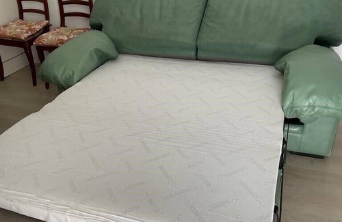 The bedrooms feature each a double bed and the living room a sofabed. The house also includes a shared bathroom with a shower.