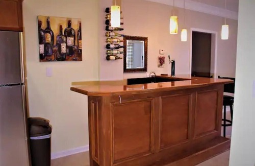 You will be amazed at this lovely resort-like 2 bedroom 1 bath apartment located on the terrace level of my home! Open and spacious enough for you, your pets and your group to feel super comfortable and entertained! You will have your own private outdoor area, fully fenced with lots of room for pets to play, a child's cedar play set and a pool with covered outside dining. There is plenty of seating and a grill. You can watch the game or a movie in your own private theater that seats up to 10! The theater can double as a bedroom if needed. It has 2 sofas that convert to full size beds. There is a fully equipped dine-in kitchen, laundry room with washer and dryer, large living room with built-in bar, 1 bathroom and 2 bedrooms.