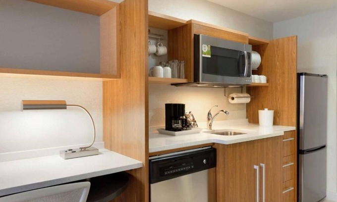✦ Each room is 300 sq. ft, equipped with complimentary toiletries, kitchen with basic amenities, high definition 42-inch TV, available with Premium cable, ensuring cleanliness and comfort throughout your stay.