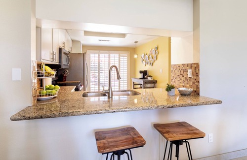 The Kitchen is stocked with everything you will need to prepare a healthy breakfast (juicer, egg poacher, Nutribullet, electric skillet) or a dinner off the gas BBQ. Well equipped with refrigerator with filtered water|ice maker, electric stove|oven, microwave, dishwasher and disposal. There is also kitchen essentials; oil, salt, pepper, foil, plastic wrap, paper towels and dish soap.