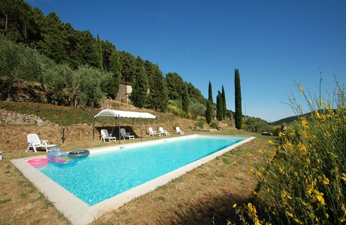 The property lies in a beautiful area of the Tuscany, surrounded by olive grove hills and green thick woods of pine trees; near to the most important art city of Italy (Florence, Voters, San Gimignano, Pisa, Lucca) and to the Versilia coast. The position and the altitude of about 300m on the sea level, guarantee a mild and agreeable climate in every season. It lies in a panoramic location around 1,5 kms from the village of Buti. It is a quiet location that provides a lot of privacy to the guests. From the large terrace (equipped with table and chairs to eat outside) and the pool area you can enjoy the nice views on the surrounding hills. The pool (for your private use) is 14 meters long and 5,5 large, the depth is 1,5 meters. On the property there are 2 houses (only rented together) for a total of 6 bed rooms and 14 sleeps (max 13 adults or 12 adults and 2 children). The big house has 4 bedrooms / 9 sleeps while the other one has 2 bedrooms and 5 sleeping places. The houses have been restored with a special attention for the original materials (terracotta, wood, stone…) and furnished with furniture of the Tuscany tradition. The big house has on the ground floor a kitchen, living / dining room, a double bedroom and a toilet. On the first floor there are 3 bedrooms and 2 bathrooms. It has in total 9 bed places (max 8 adults or 7 adults and 2 children). The small house has on the ground floor a kitchen, living/dining room, bathroom with shower and toilet. On the upper floor there is a bedroom with 2 single beds, a bedroom with double and single bed, a toilet. It is also possible to have a cot and high chair.
