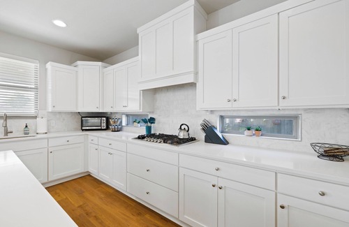 After exploring Bentonville, stop by the Walmart Neighborhood Market just around the corner and get ready to use the fully equipped kitchen to cook a family meal. Aside from all the kitchen basics, you’ll also find a rice cooker, an InstantPot, and a bubble waffle maker. If you’re traveling with young ones, there are kids' plates, bowls, and cups available for use in addition to a high chair.