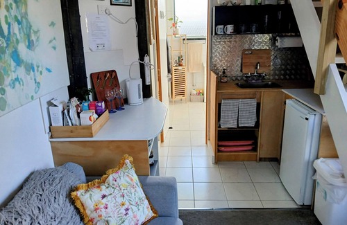 Huge charm in a Tiny space. Upon entering the bnb your eyes are drawn up to the 11 foot ceiling which gives you an instant "wow" moment as you feel the space grow. The bnb has been designed thoughtfully to maximize every inch to achieve the impression of a larger Space!