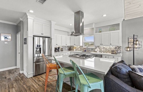 Pier Activities: Enjoy the private pier available to guests of the 2 Retreat Combo, which provides a perfect setting for relaxing or taking in beautiful sunsets. You'll find it ideal for afternoon strolls or simply soaking in the stunning views of Galveston Bay.