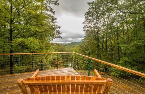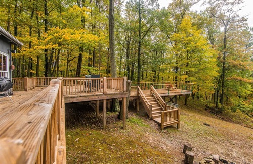 On a clear day you can see the tower at the south entrance of the Brown County State Park which is about five miles as the crow flies. In the fall, as you take a relaxing dip in the hot tub, you have one of the best private vistas to be enjoyed in this part of the world. A well-marked mile-long trail past the tree house, around the blue gill stocked pond and down to the confluence of the streams connects on the top of the west side of the property to the Yellowwood trail system which then leads back up to the path in the front of the cabin.