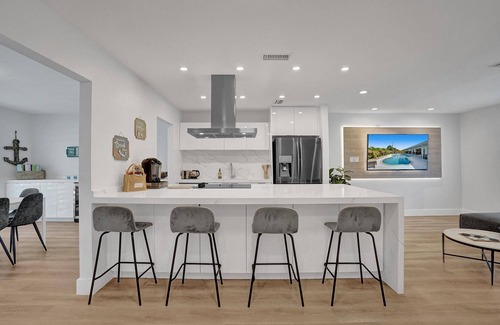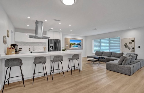 2 homes side by side. Ideal for a group of 16, immaculately clean, remodeled & modern, featuring 6 bedrooms, 4 baths + office. Just 15 minutes from Las Olas, the beach, FLL airport, Hard Rock Casino, and Stadium, this prime location offers convenience. Enjoy a heated saltwater pool, 2 fire pits, hammocks, artificial turf, 3 BBQ grills, night lighting, axe throwing, cornhole, connect 4, pool floats, and more. Luxury towels and linen for your comfort. Quick access to major highways (4 min)