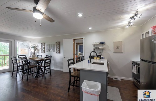 Hidden Hideaway is a wonderfully quiet, NEWLY UPDATED, 4 BD/4 BA conjoined walk-in unit. Each side has 2 bedrooms, 2 baths, a living area, and kitchen. Just minutes from Silver Dollar City and the Indian Point Marina, this location is full of amenities including an outdoor pool and a hiking trail to the catch-and-release lake. A quick drive takes you to the Strip and all that Branson has to offer. Enjoy your stay, and hide-away. PLEASE NOTE: This property is currently listed on the market for sale. Showings can be requested throughout your stay, advance notice will be provided.