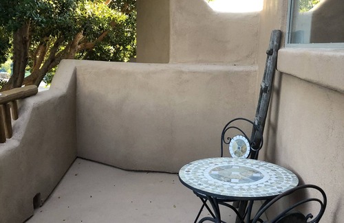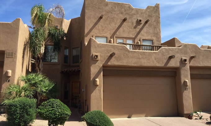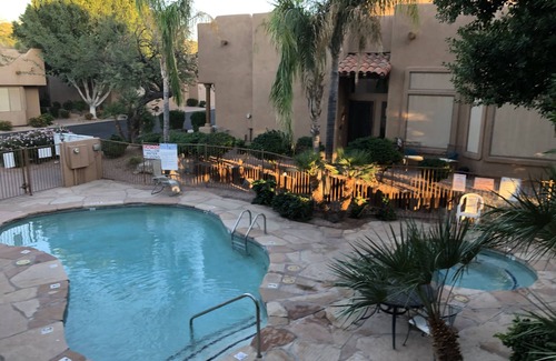 2 large master suites each with full en-suite baths in upper level of our townhome. One suite has a king bed and the other has a queen and 2 twins. Both suites have cable TV’s & decks with views. Between the suites is a large loft with a daybed and pull-out trundle. There is also a kitchenette with mini-frig, microwave, coffee maker, kettle, toaster, blender, &. mini-crockpot. Coffee, tea, creamer, sweeteners, bottled water, paper plates, cups, & plasticware provided. A small dining table with 2 chairs and a bench as well as a computer desk and printer are also in the loft. A community outdoor pool (not heated) & hot tub are also available. There is no private entrance. You enter and exit via our common front door and go up the interior staircase to the upper level suites. No pets/no smoking except on outside decks. All utilities and wifi included in rent. Free parking on street outside complex gate. Near shopping & restaurants yet close to pristine desert recreation.