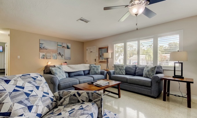 Welcome to our charming getaway near stunning white sandy beaches and delightful restaurants. Lovely two bedroom 2 bath. Enjoy the bonus room with a sofa bed prefect for kids or relaxed lounging, equipped with games, a PS4 system and a Fire Stick TV. Primary bedroom with king bed and 55" TV and local cable. Living room with sofa, love seat, recliner and 65"cable TV. Secondary bedroom with queen bed and Roku TV connection. Fantastic location in quiet neighborhood! Well behaved small pets welcomed. Large fenced yard for pets and children to enjoy. Redington and Indian Shores beach minutes away. Easy drive to take in activities in CLEARWATER and ST. PETERSBURG and at JOHNS PASS entertainment area. Close to Seminole City Center and Pinellas trail for hiking/bicycling, Can ride your bike to south to St Petersburg or north to Tarpon Springs. Multiple parks are close. Less than 10 minute drive to VA Hospital in Bay Pines. Tamp International airport approximately 25 mile. Local Co Host knows the area and is a phone call if you have questions. Garage remains closed and locked, guests may use the space for laundry and beach items.