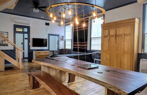 Old world charm surrounds you in this unique renovated one room schoolhouse. Two upstairs bedrooms (king and queen bed with white linens) added to this 1840 gem with heat pump mini splits and custom woodwork and furniture throughout. Sleep in the main room on a handmade Murphy bed to experience the first floor sleeping. Full kitchen with new appliances, many cutting boards and a Blackstone griddle on the chill back porch. Additionally I have a canoe stored at lake Jean that you are welcome to use while visiting. Fire pit and an EV car charger are also here for you.