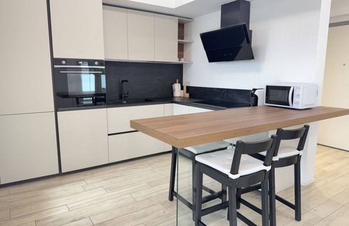 A large modern space combining the living room and kitchen. The living room is furnished with a double sofa bed, flat-screen TV and a comfortable dining table. The designer kitchen, with a peninsula and high chairs, is perfect for breakfasts and socialising.