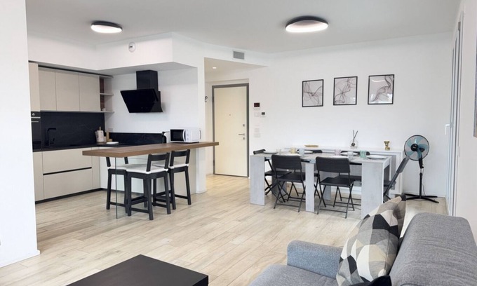 Elegant modern apartment located just behind Bergamo\'s new Chorus Life complex. It has two bedrooms, two bathrooms and a large living room with a sofa bed, ideal for accommodating up to six people. The terrace is a private oasis with sun loungers, a dining table and a hot tub, perfect for relaxing outdoors. The designer interiors, with attention to detail, offer comfort and style in a quiet but central location.