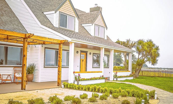 The SEASONG House, a mid-century modern gem, is designed for comfort and style with one bedroom, five beds, and 1.5 bathrooms. Featuring ocean-view decks and a fully stocked kitchen, its elegant decor creates a cozy yet luxurious retreat, perfect for drifting off to the sound of crashing waves. It also includes a gaming room.