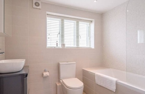 This practically furnished bathroom offers a modern white suite with large bath with hand held shower over and glass screen, rectangular basin set on a useful vanity unit and a WC. Sunlight floods in through the triple window with blind and the smart beige tiles give a clean fresh finish.