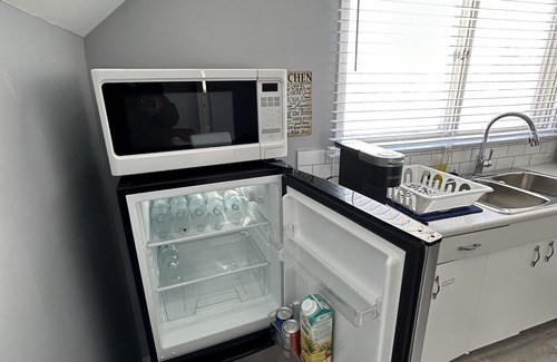 The kitchen has a coffee maker, toaster, fridge and snacks.