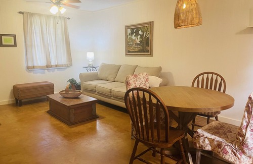 28 days rental or more. Quiet, peaceful, cozy. Country town with a southern draw. Unwind in our quaint little apartment surrounded by beautiful oaks and pine trees. Its a great getaway for work or play. It’s a slow paced life that you will enjoy.