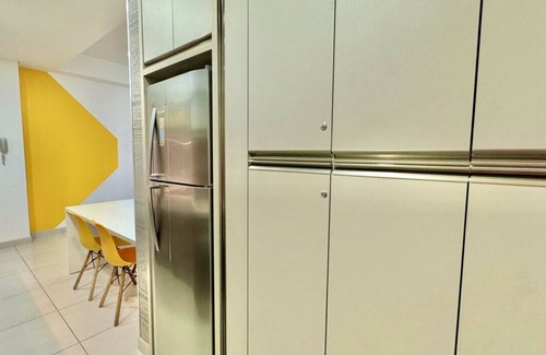 Cozinha completa com forno, fogão, geladeira e utensílios, bem gourmet, com lava e seca.