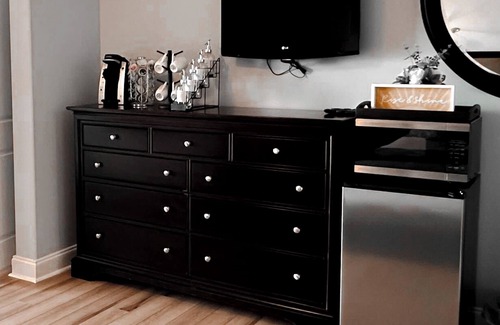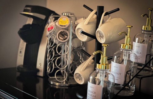 * Kitchenette – Equipped with a small refrigerator, coffee bar, and microwave for added convenience.